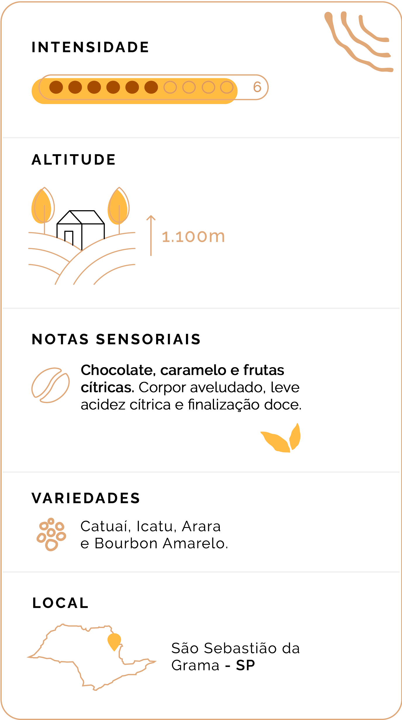 ☕ 100% arábica - Variedades: Catuaí, Icatu, Arara e Bourbon Amarelo