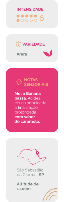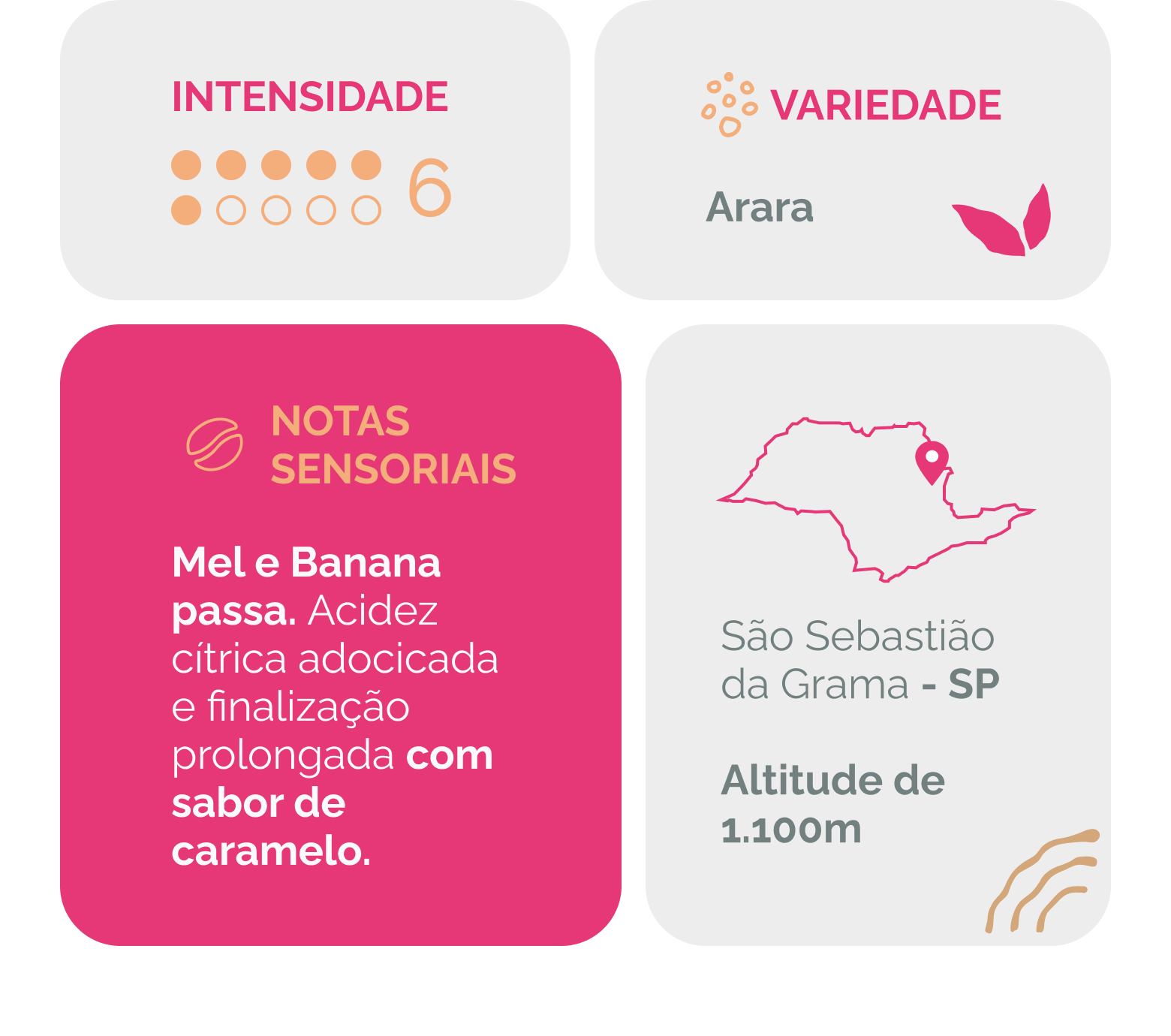☕ Notas sensoriais: mel e banana passa. Acidez cítrica adocicada e finalização prolongada com sabor de caramelo.