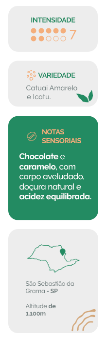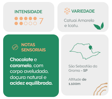 ☕ Notas sensoriais: chocolate e caramelo, com corpo aveludado, doçura natural e acidez equilibrada.